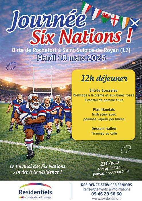 Journée Six Nations aux Résidentiels - Mardi 10 mars 2026 à 12h Nous vous invitons à partager un déjeuner convivial aux saveurs du tournoi des Six Nations. Un moment chaleureux pour se retrouver et profiter d'un bon repas dans une ambiance festive. 8 rue de Rochefort - Saint-Sulpice-de-Royan 21 € par personne Sur réservation au 05 46 23 58 60 (places limitées) ou en remplissant le formulaire.