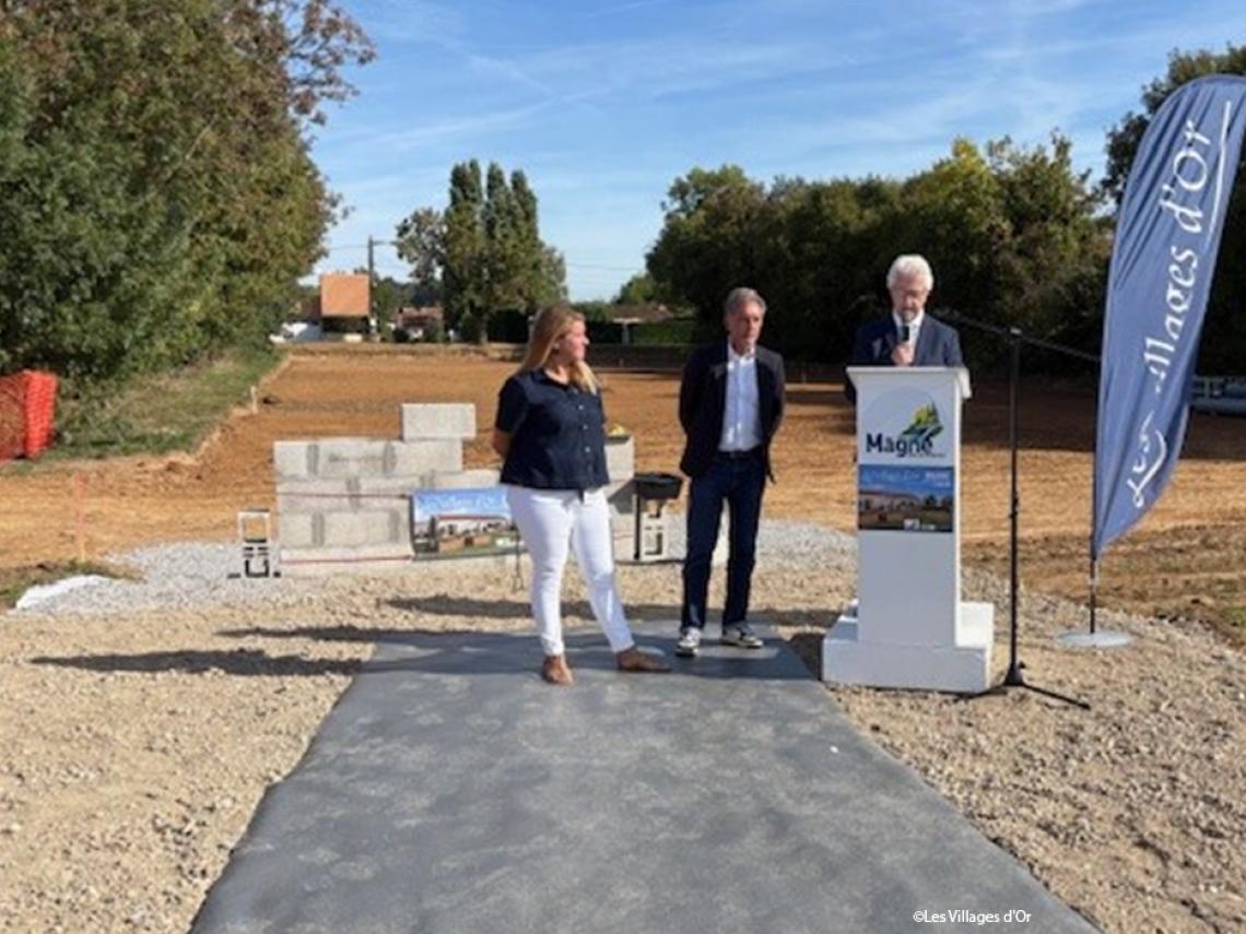 Mercredi 1er octobre, a eu lieu la pose de la première pierre de la nouvelle résidence seniors au 1 rue des Iris à Magné, en présence de Gérard LABORDERIE, Maire de la Commune de Magné, des élus du Conseil Municipal, de Maxime Rouaud, architecte de l'opération (cabinet MA-ARCH), et de Marie ESTOURNET, Présidente Directrice Générale du groupe Les Villages d'Or.